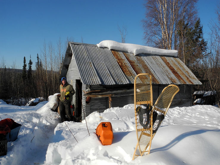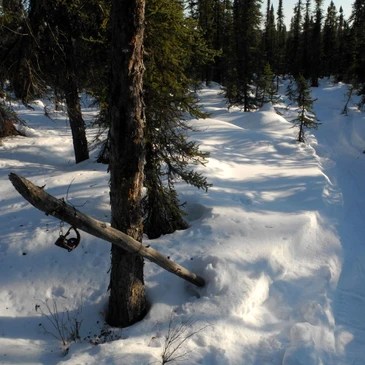 Après un autre repas cuit sur le poêle de cette minuscule cabane de jour – j’ai l’impression de ne faire que manger –, nous cherchons l’entrée d’une ancienne piste que Scotty avait dégagée l’hiver dernier.