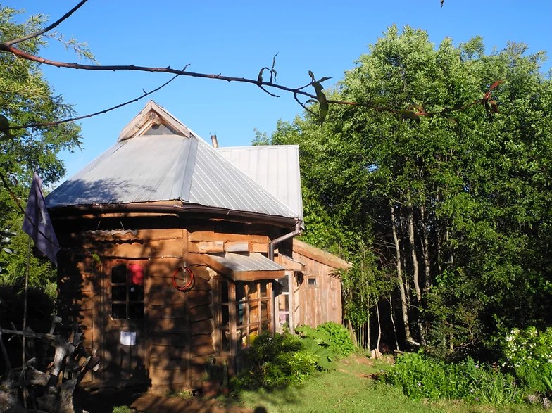 Il y a trois pièces : une grande en bas avec le poêle et une mezzanine ouverte en haut d’un petit escalier. La salle de bain, avec l’eau chauffée au soleil ou par le poêle, est rajoutée dans l’appentis.
