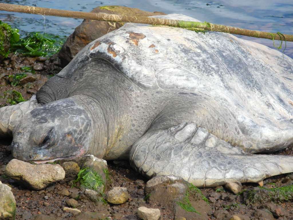 Giselita (« petite Giselle » !) la tortue géante, sort tous les soirs au même endroit pour faire la sieste au soleil, dans le port de Hanga Roa.