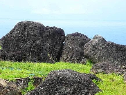 Les pétroglyphes du site cérémoniel Orongo, entre l’océan et le vaste cratère du volcan Rano Kau, sont les marques d’un nouveau culte apparu sur l’île vers la fin de la période préhistorique :